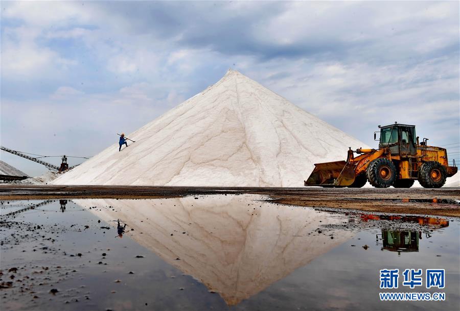 7月3日,唐山海港經濟開發區大清河鹽場的工人在洗鹽場工作。 近日,長蘆鹽區河北省唐山海港經濟開發區大清河鹽場的春扒工作進入尾聲,今年預計春鹽產量將達29萬噸。 新華社記者 楊世堯 攝