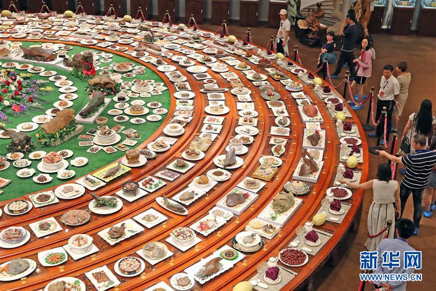 6月28日,游客在參觀“奇石宴”。 新疆哈密賞石文化博物館里這桌由象形石組成的“奇石宴”,由1088道“特色菜品”組成,“宴席桌”直徑16.8米,占地面積200多平方米,吸引了眾多游客的目光。 新華社發(蔡增樂 攝)