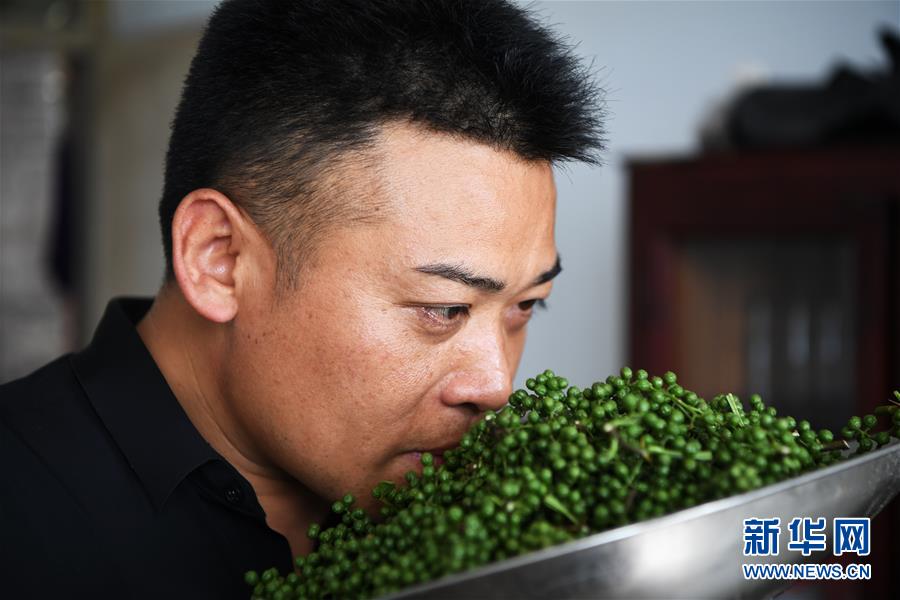 6月27日,劉毅在聞剛采收回來的花椒香味。