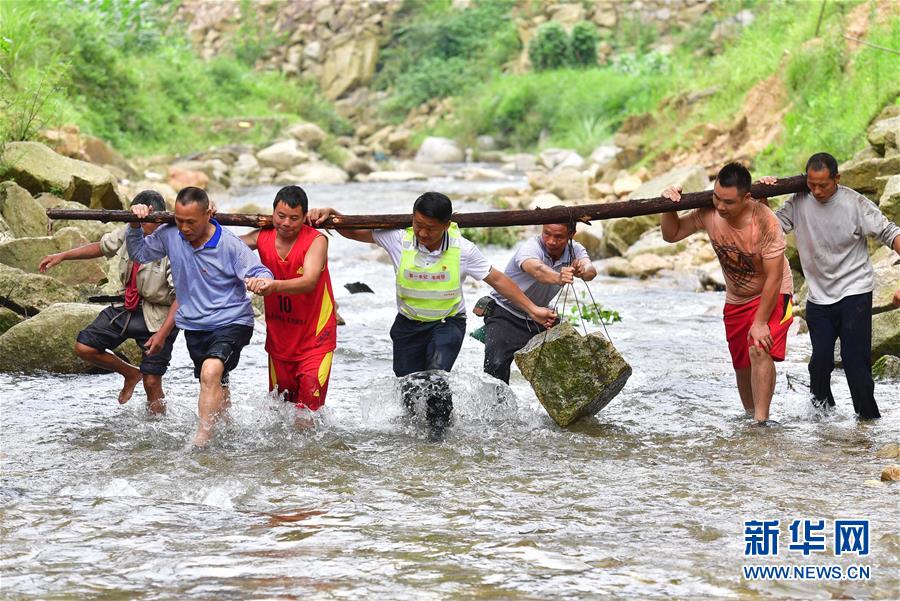 在烏英苗寨,駐村第一書記韋桂華(右四)、黨員梁成兵(右三)、梁志新(左二)帶領村民維修河堤(6月30日攝)。