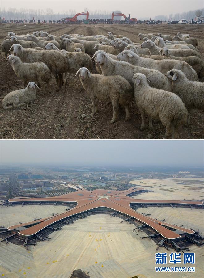 拼版照片:上圖為2014年12月26日拍攝的北京新機場奠基現場,附近農田里的一群羊經過記者鏡頭前(新華社記者羅曉光攝);下圖為2019年6月25日無人機拍攝的即將竣工的北京大興國際機場航站樓(新華社記者張晨霖攝)。 2019年6月30日,北京大興國際機場如期竣工。從2014年12月飛行區工程破土動工到竣工驗收、從牛羊遍地的“牧場”到大型國際航空樞紐,北京大興國際機場的建設只用了短短四年半時間。 新華社發