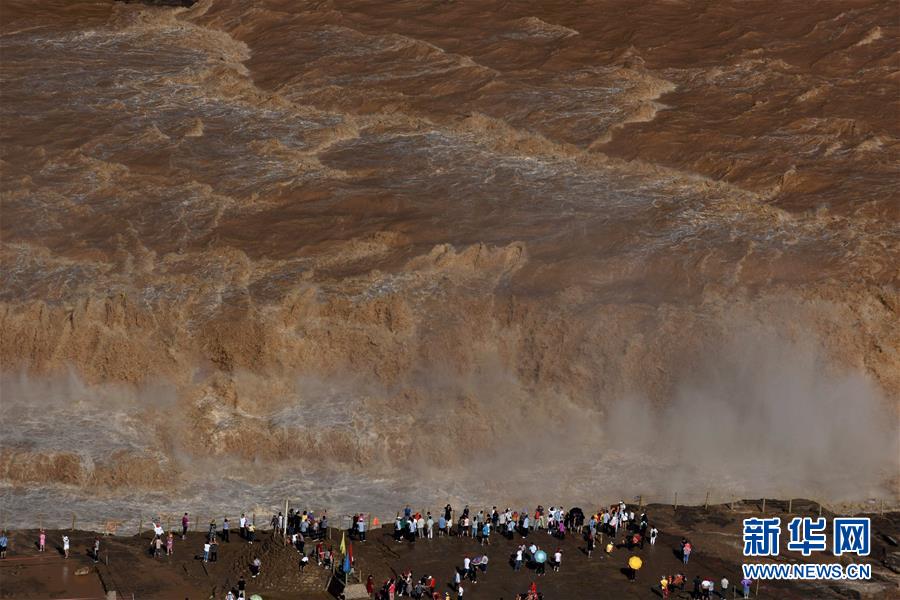 6月30日,游客在位于山西吉縣的黃河壺口瀑布景區游覽。 近日,受上游降雨和水庫泄洪影響,黃河壺口瀑布水量大漲,形成特大瀑布群景觀,吸引了眾多游客。 新華社發(呂桂明 攝)