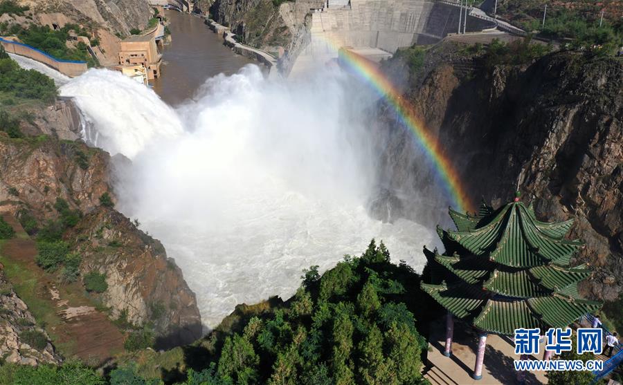 劉家峽水庫進行排沙泄洪作業(6月30日無人機拍攝)。 據介紹,受近日持續降雨影響,劉家峽水庫開啟溢洪道閘門,加大下泄水量,為黃河平穩度汛提供有力保障。 新華社發(史有東 攝)