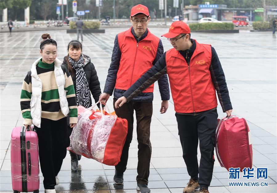 1月2日,志愿者在火車站幫助旅客拿行李。 當日是傳統臘八節,浙江省余姚市大城小愛公益服務中心的愛心志愿者帶著親手熬制的臘八粥,到余姚市環衛站、火車站等地,為環衛工人、返鄉人送去臘八粥,用愛心溫暖每一個人,同時也向人們傳遞志愿服務的公益精神。 新華社記者 徐昱 攝