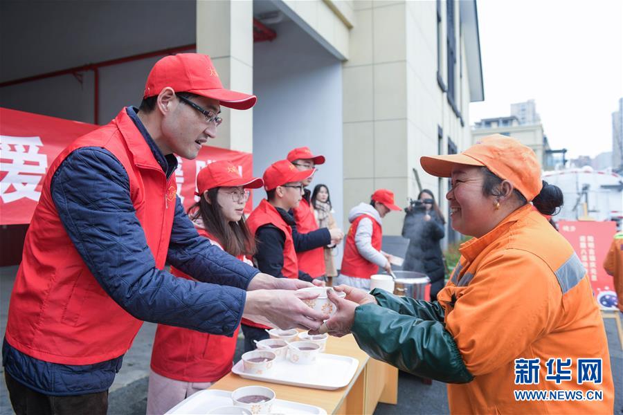 1月2日,志愿者在余姚市鳳山街道東風垃圾中轉站為環衛工人送上愛心臘八粥。 當日是傳統臘八節,浙江省余姚市大城小愛公益服務中心的愛心志愿者帶著親手熬制的臘八粥,到余姚市環衛站、火車站等地,為環衛工人、返鄉人送去臘八粥,用愛心溫暖每一個人,同時也向人們傳遞志愿服務的公益精神。 新華社記者 徐昱 攝