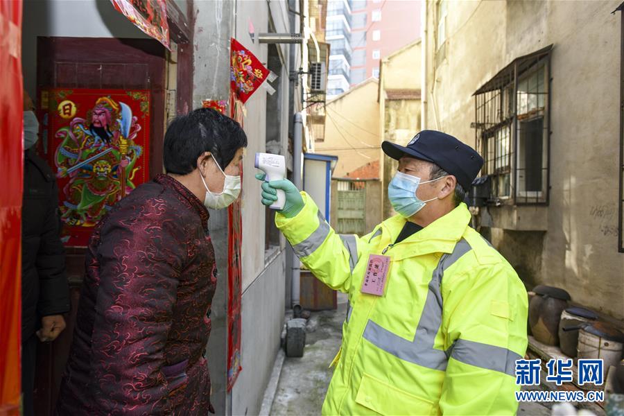 2月20日,62歲的退休民警劉漢楚在孝感市孝南區(qū)九真社區(qū)為居民測量體溫。