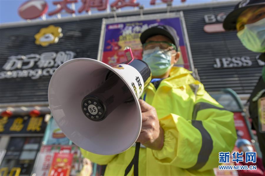 2月20日,64歲的退休民警汪柏林在孝感市城區(qū)的一家超市前開展防疫宣傳工作。新華社記者 胡虎虎 攝
