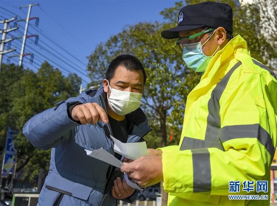 2月20日,63歲的退休民警潘旭亮在孝感市孝武大道東山頭疫情防控工作點值守。新華社記者 胡虎虎 攝
