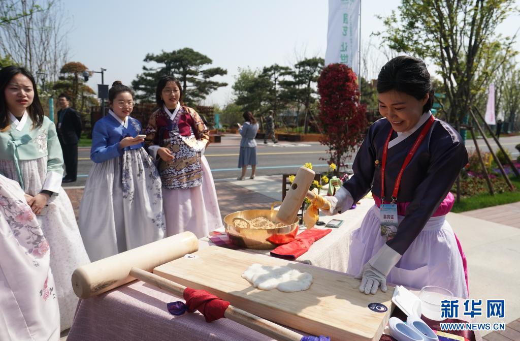 4月8日,在2021年揚州世界園藝博覽會韓中緣館,韓國參會人員在制作美食。