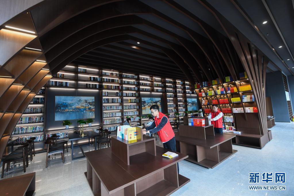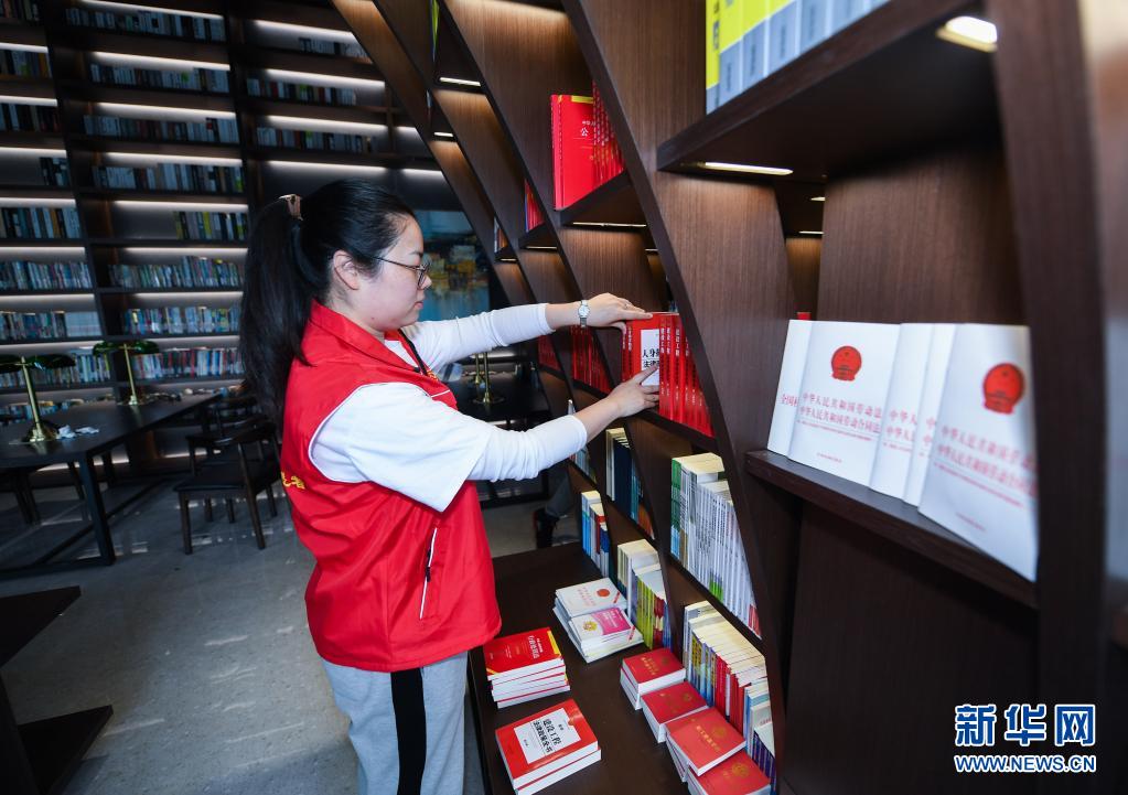 4月21日,工會志愿者在湖州市吳興區(qū)新時代職工普法基地的職工書屋內(nèi)把各類法律書籍擺放上架。