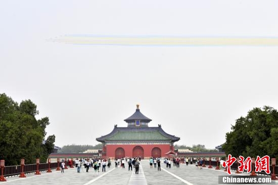 7月1日上午,慶祝中國共產黨成立100周年大會在北京天安門廣場隆重舉行。圖為市民在天壇公園觀看飛行慶祝表演。 中新社記者 田雨昊 攝