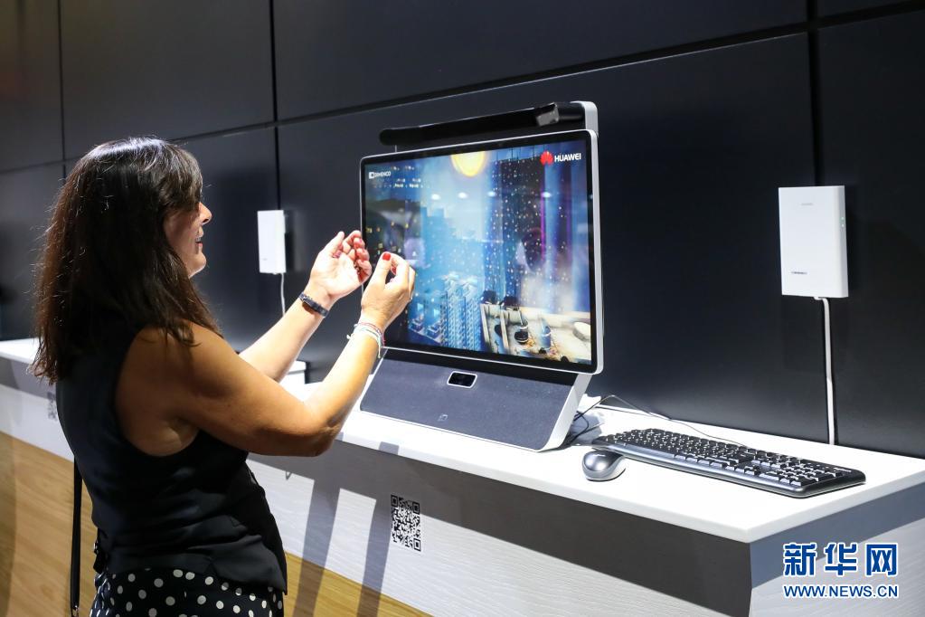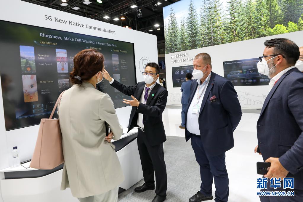 6月28日,在西班牙巴塞羅那,工作人員(左二)在世界移動(dòng)通信大會(huì)華為展廳介紹5G技術(shù)的應(yīng)用場(chǎng)景。