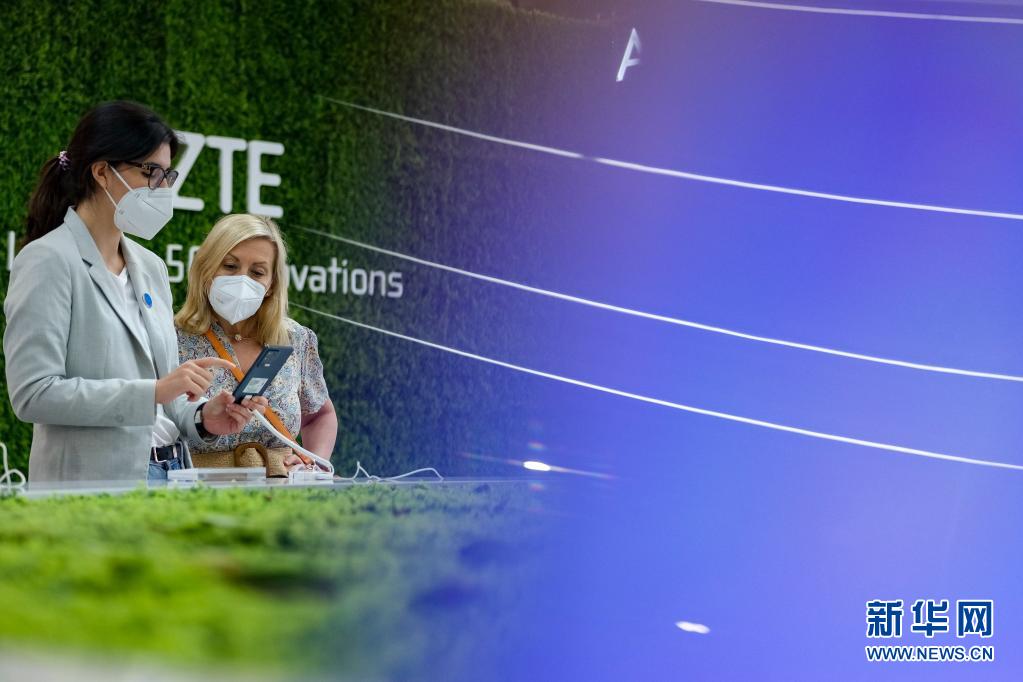 6月29日,在西班牙巴塞羅那,工作人員(左)在世界移動(dòng)通信大會(huì)中興展廳向觀眾介紹一款5G手機(jī)。