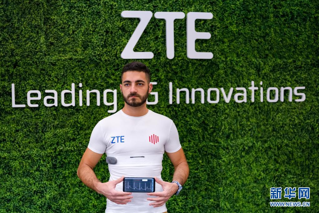 6月29日,在西班牙巴塞羅那,工作人員在世界移動(dòng)通信大會(huì)中興展廳展示一款“5G智慧T恤”。這款T恤將聚合傳感器直接集成入織物實(shí)時(shí)監(jiān)控并通過(guò)5G信號(hào)傳輸穿戴者的呼吸、心跳、體溫等生物指標(biāo)。