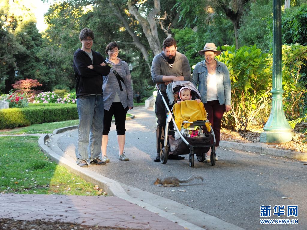 7月1日,在美國舊金山灣區(qū)城市圣馬特奧,在公園休閑的人們注視著一只路上的松鼠。
