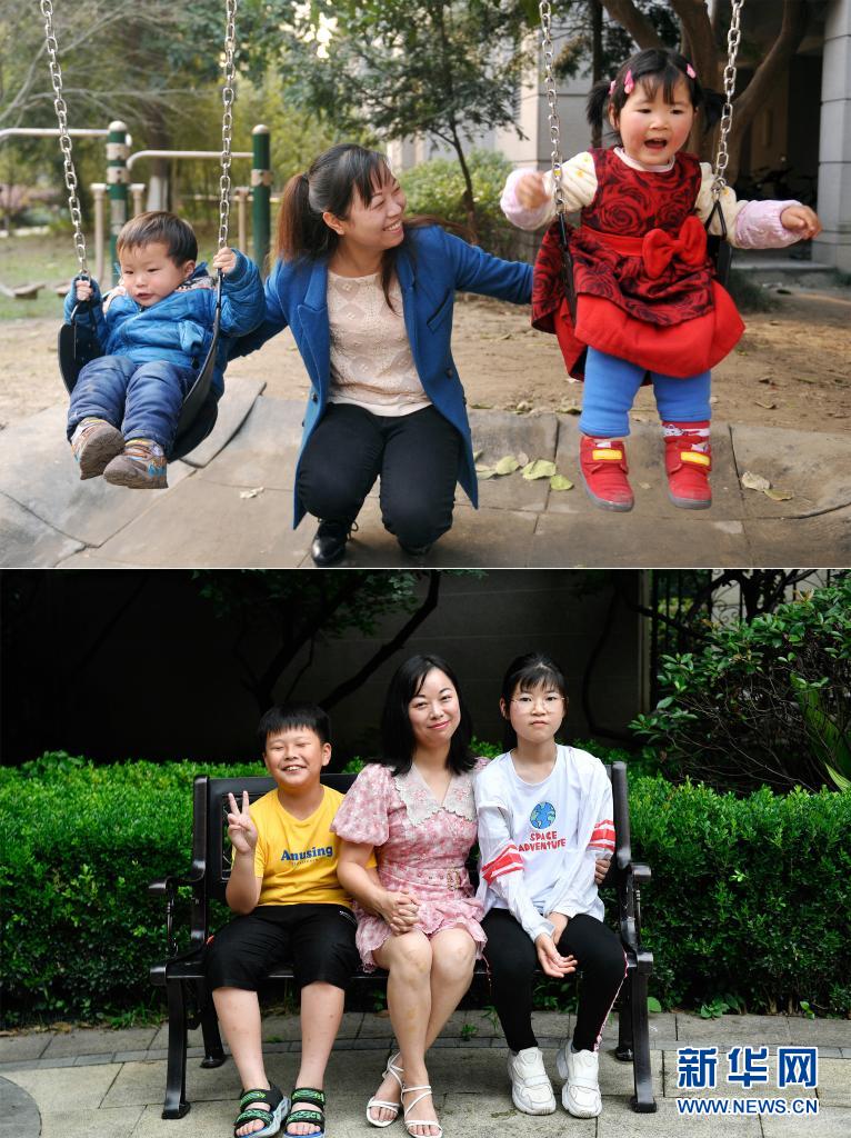 這是一張拼版照片:上圖為:2013年2月24日,吳菊萍帶著兒子陳至軒(左)與妞妞(右)在浙江杭州的小區玩蕩秋千;下圖為:7月1日,吳菊萍帶著兒子陳至軒(左)與妞妞(右)在浙江杭州的小區合影。新華社記者 黃宗治 攝