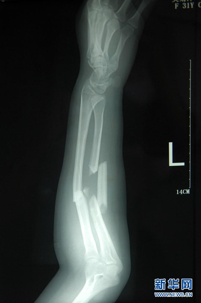 這是2011年7月3日拍攝的吳菊萍受傷左臂的X光片,醫生診斷為手臂左尺橈骨多段粉碎性骨折。新華社記者 黃宗治 攝