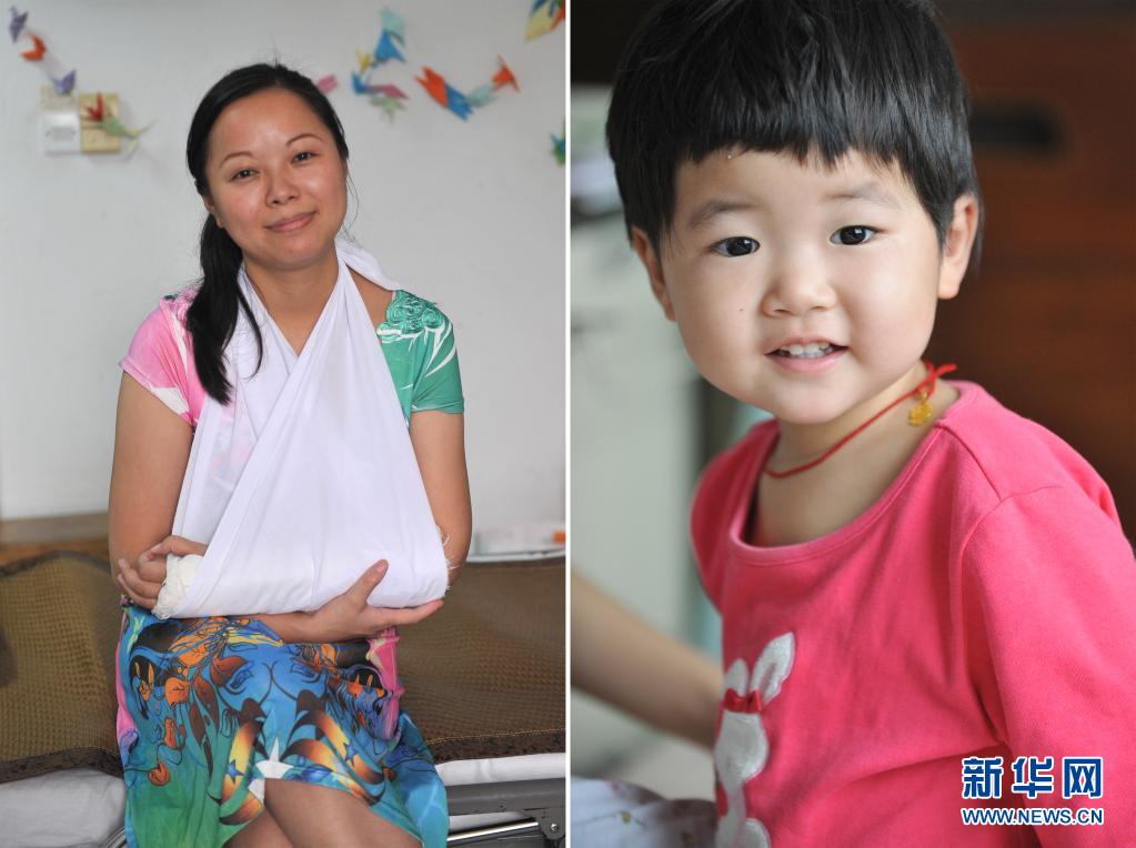 這是2011年8月25日分別拍攝的在病房中恢復的吳菊萍(左)和“墜樓女孩”妞妞(拼版照片)。新華社記者 黃宗治 攝