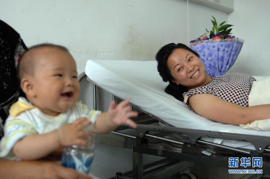當家人逗樂當時7個月大的兒子陳至軒時,在病床上養傷的吳菊萍也露出笑容(2011年7月3日攝)。新華社記者 黃宗治 攝