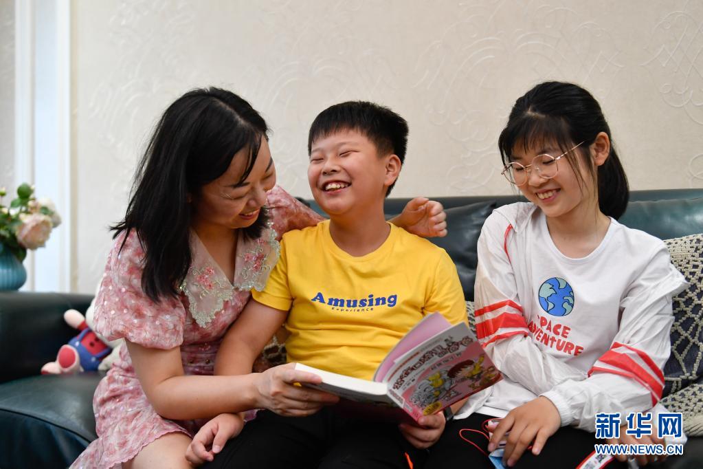 吳菊萍的兒子陳至軒(中)在浙江杭州的家中與妞妞(右)分享課外書籍(7月1日攝)。新華社記者 黃宗治 攝