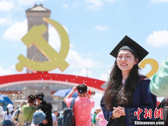 7月3日,天安門廣場上的慶祝中國共產(chǎn)黨成立100周年主題景觀吸引民眾游覽。圖為一名女子身著學(xué)位服在廣場上留影。 中新社記者 賈天勇 攝