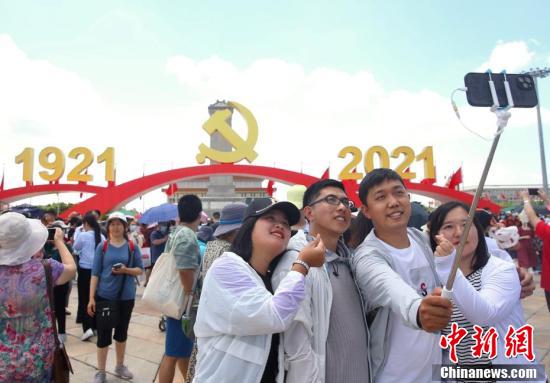 7月3日,北京天安門廣場上的慶祝中國共產(chǎn)黨成立100周年主題景觀吸引民眾游覽。圖為四名青年在廣場上自拍。 中新社記者 易海菲 攝