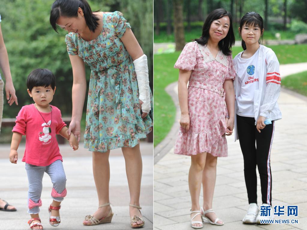 這是一張拼版照片,左圖為:2011年9月12日,吳菊萍牽著妞妞在浙江杭州一小區散步;右圖為:7月1日,吳菊萍與妞妞在浙江杭州一小區留影。