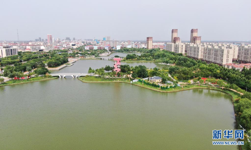 黃驊市集蓄水和城市景觀功能于一體的西湖公園(7月4日攝,無(wú)人機(jī)照片)。