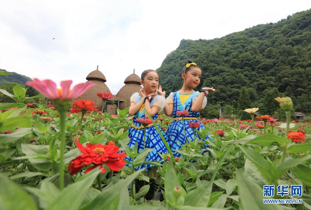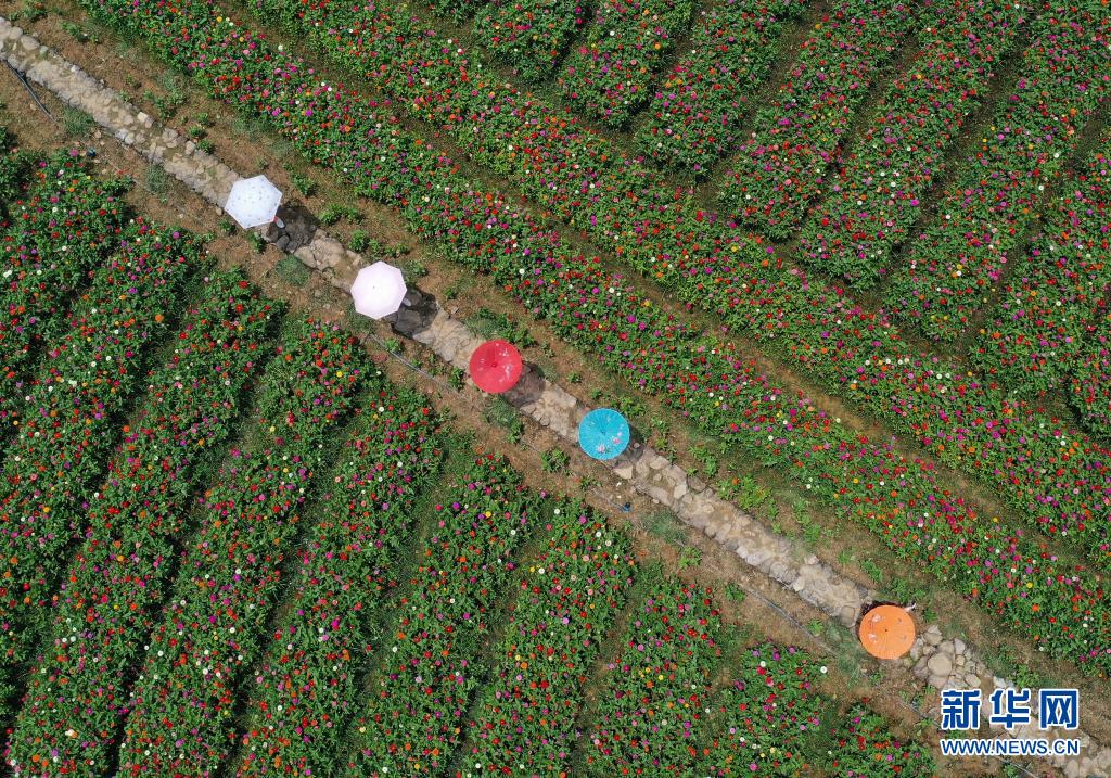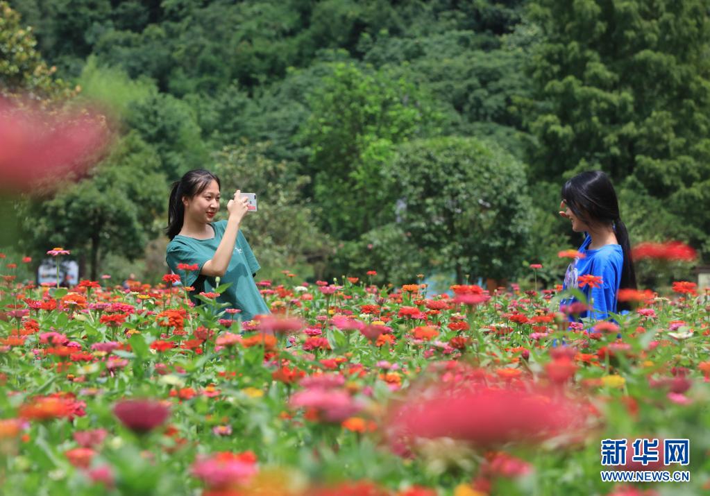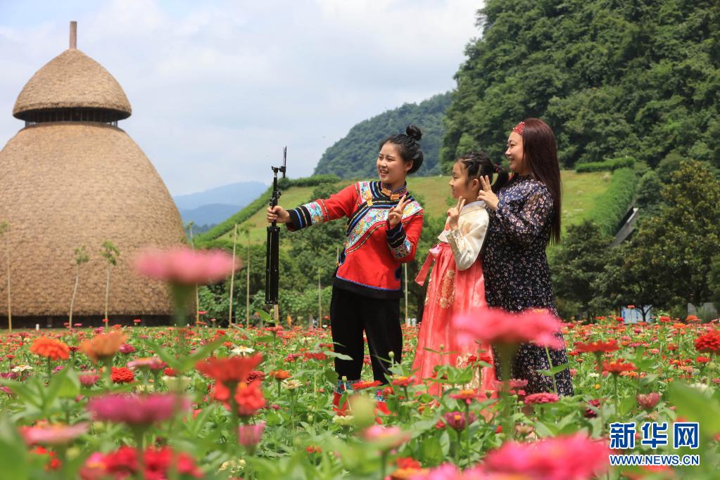 夏日的湖南張家界市武陵源區(qū)黃龍洞景區(qū),成片的百日菊形成色彩斑斕的花海,花香四溢,吸引游客前來(lái)賞花游玩。