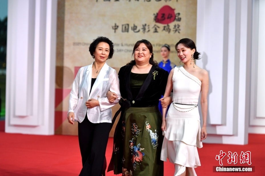 圖為張小斐(右)、賈玲(中)等亮相紅毯儀式。 中新社記者 呂明 攝
