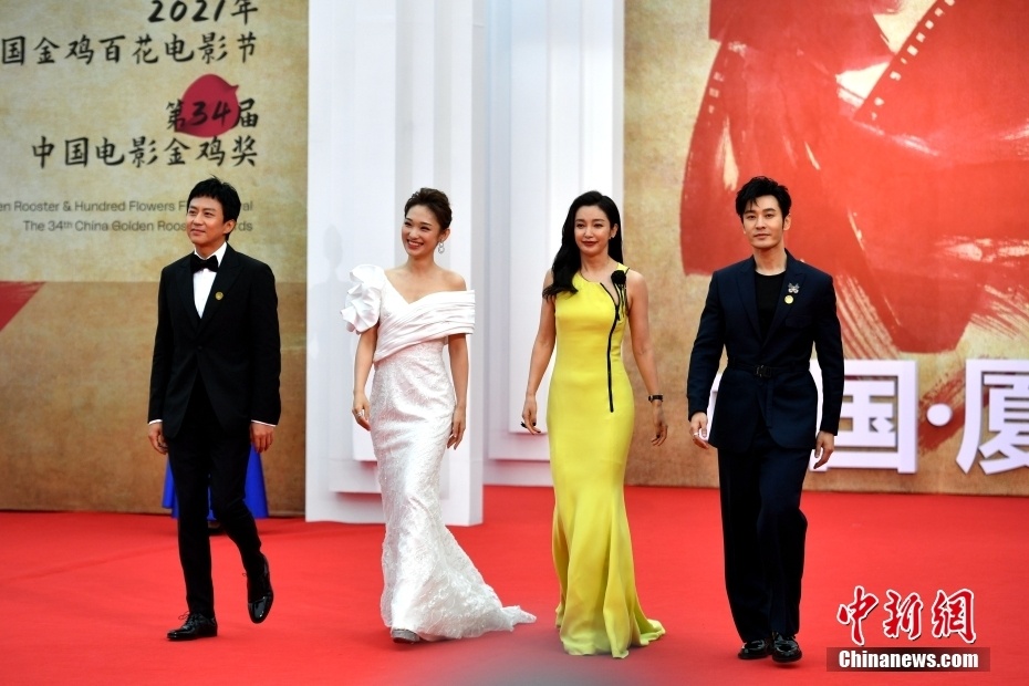 12月30日晚,第34屆中國電影金雞獎(jiǎng)紅毯儀式在福建省廈門市舉行。圖為鄧超、藍(lán)羽、李冰冰、黃曉明(從左至右)亮相紅毯儀式。 中新社記者 呂明 攝