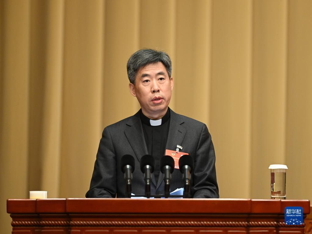 3月7日,全國政協十三屆五次會議舉行視頻會議。12名委員作大會發言。這是在主會場,沈斌委員代表宗教界作大會發言。新華社記者 劉彬 攝