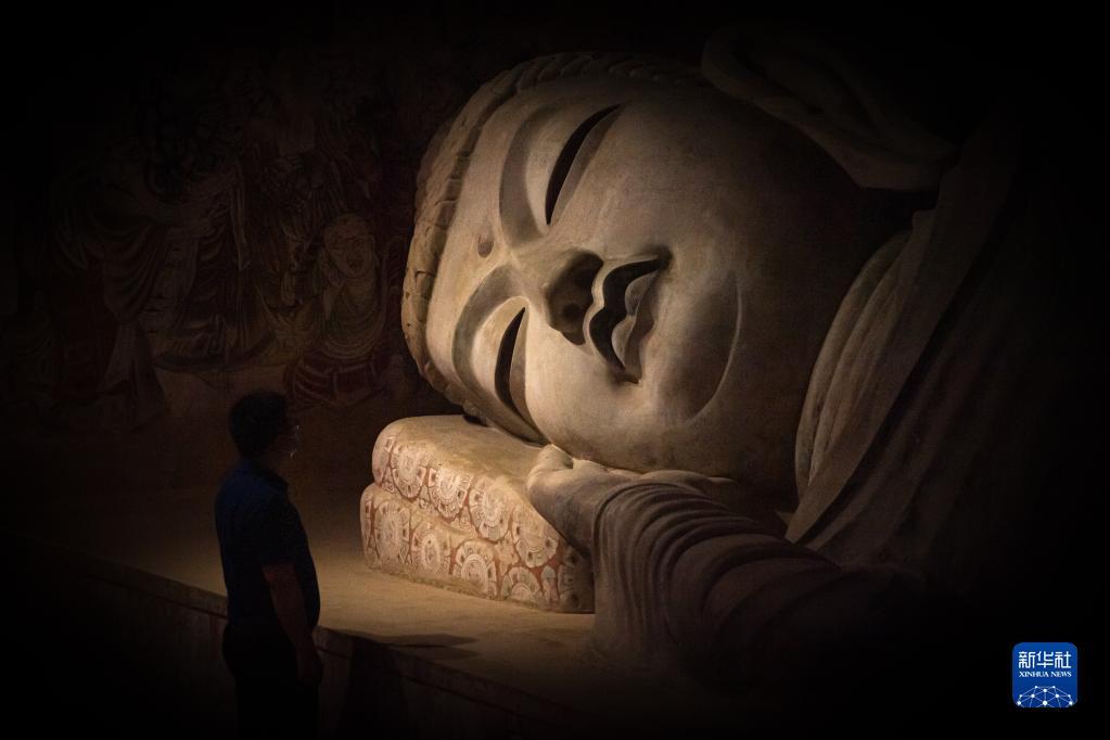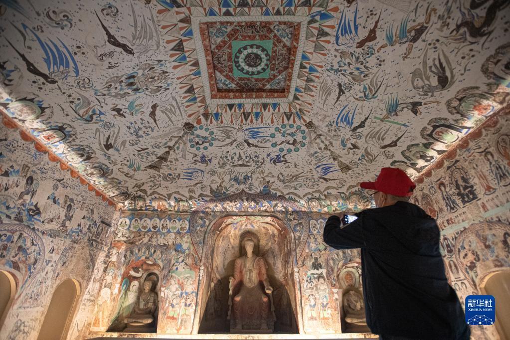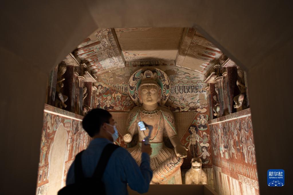 5月18日,參觀者在展出的復制洞窟里參觀。
