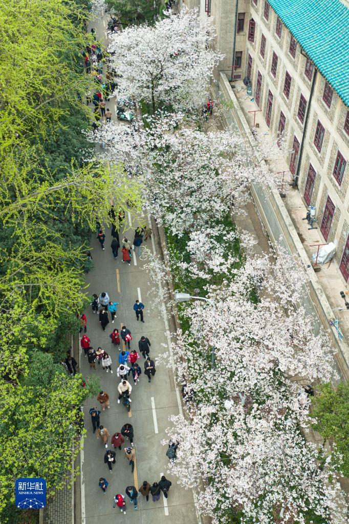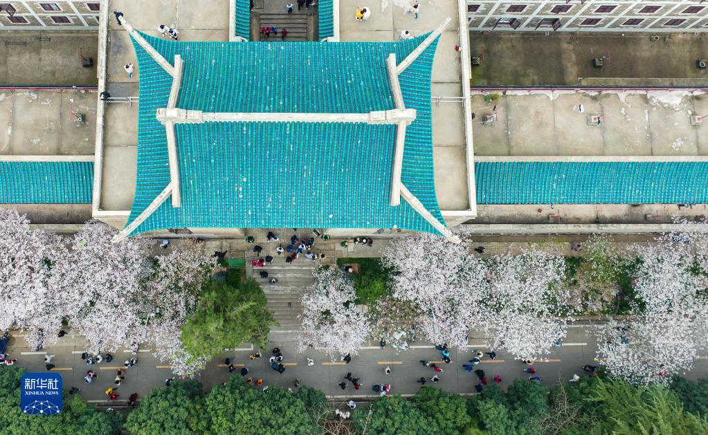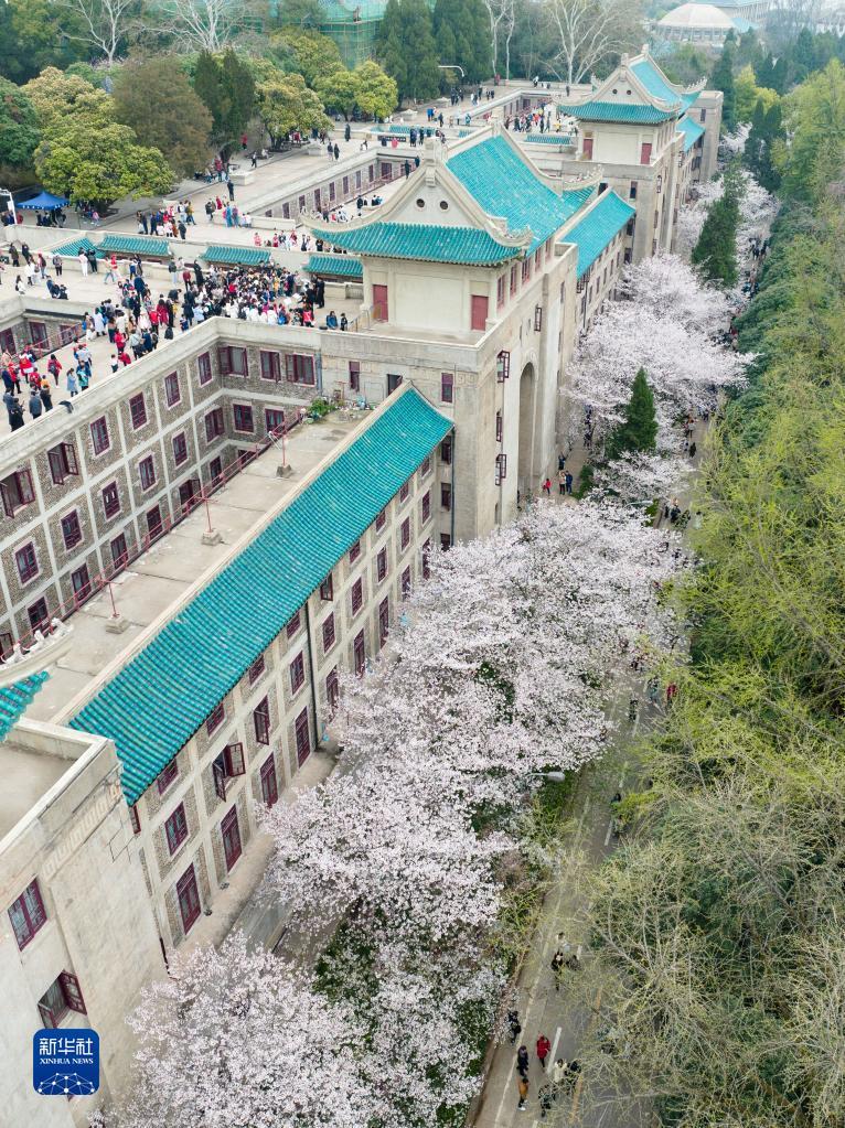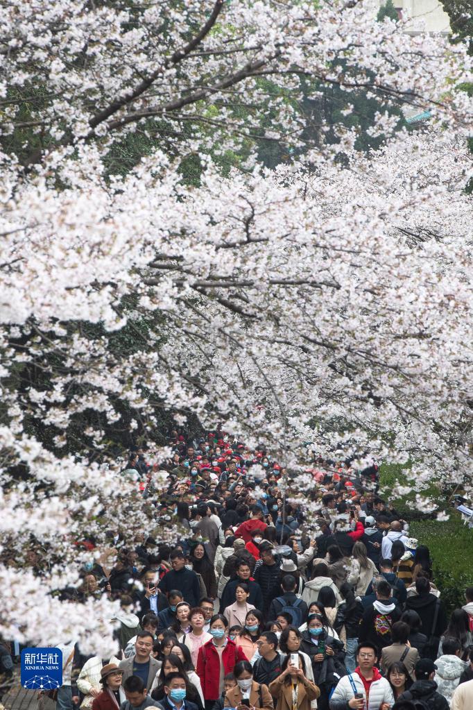 當日,武漢大學舉行抗疫醫護賞櫻專場。珞珈山下,來自全國各地的1.6萬余名抗疫醫護人員及家屬赴約賞櫻。