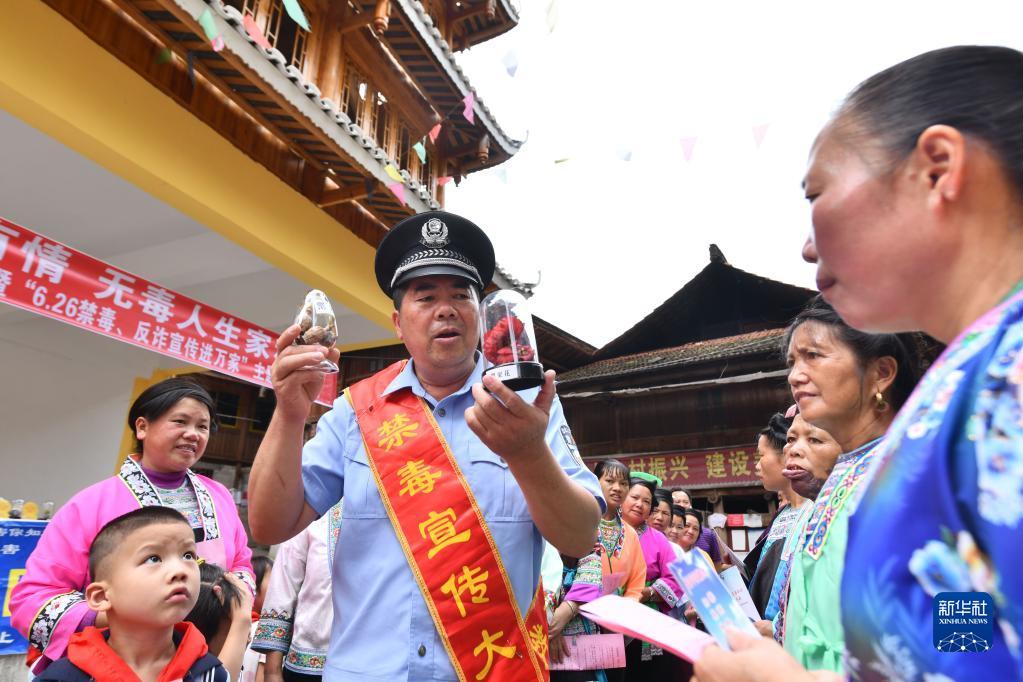 在第36個國際禁毒日來臨之際,廣西柳州市融水苗族自治縣桿洞鄉烏英苗寨開展禁毒知識進苗寨宣傳教育活動,通過講解禁毒知識、鑒別毒品樣品、發放宣傳資料等方式,幫助村民提高識別毒品能力,增強禁毒意識。