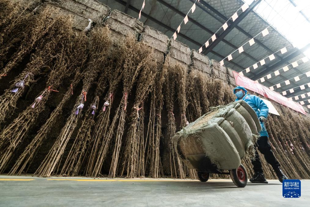 12月7日,在蘄春縣的艾草倉儲基地,工人在搬運陳艾。