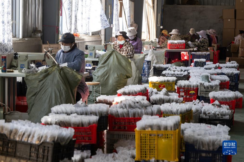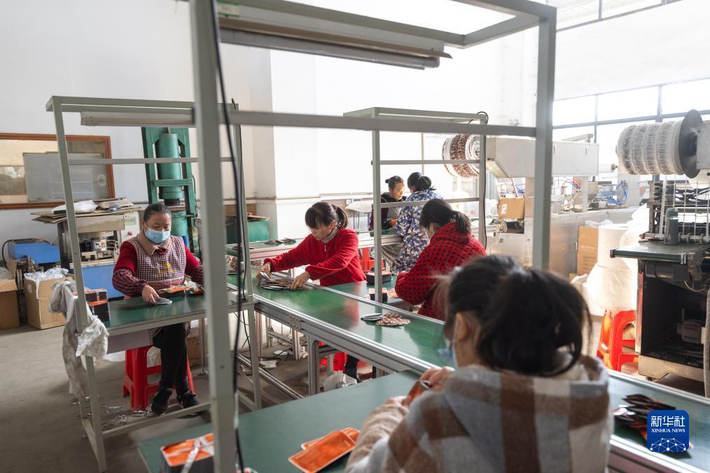 12月7日,在蘄春縣石馬山村的就業(yè)幫扶車間,工人在流水線上加工蘄艾產(chǎn)品。
