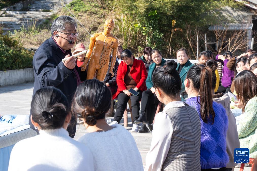 12月7日,在蘄春縣青石鎮(zhèn)大屋村,中醫(yī)艾灸師為村民講授艾灸技法。