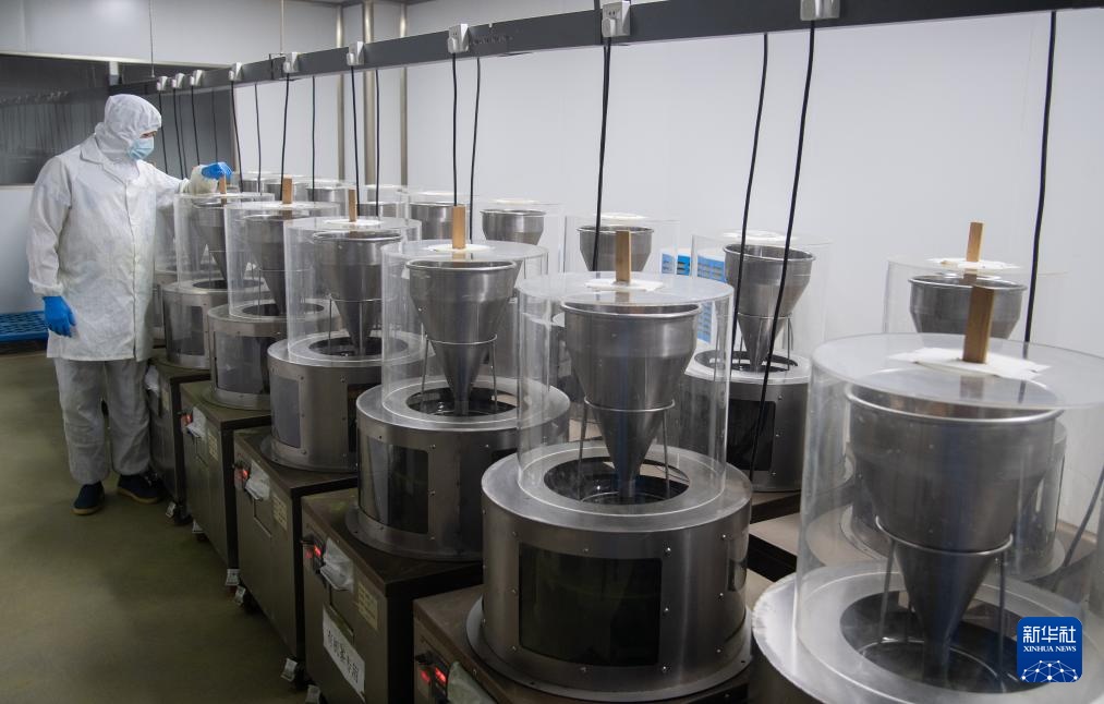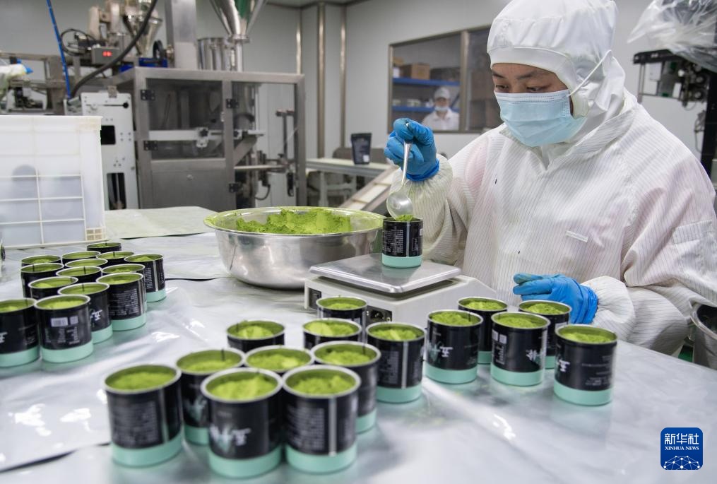 5月22日,在湖北省孝感市大悟縣金墩村湖北半兵衛(wèi)茶業(yè)有限公司生產(chǎn)車間,工作人員在分裝抹茶粉。