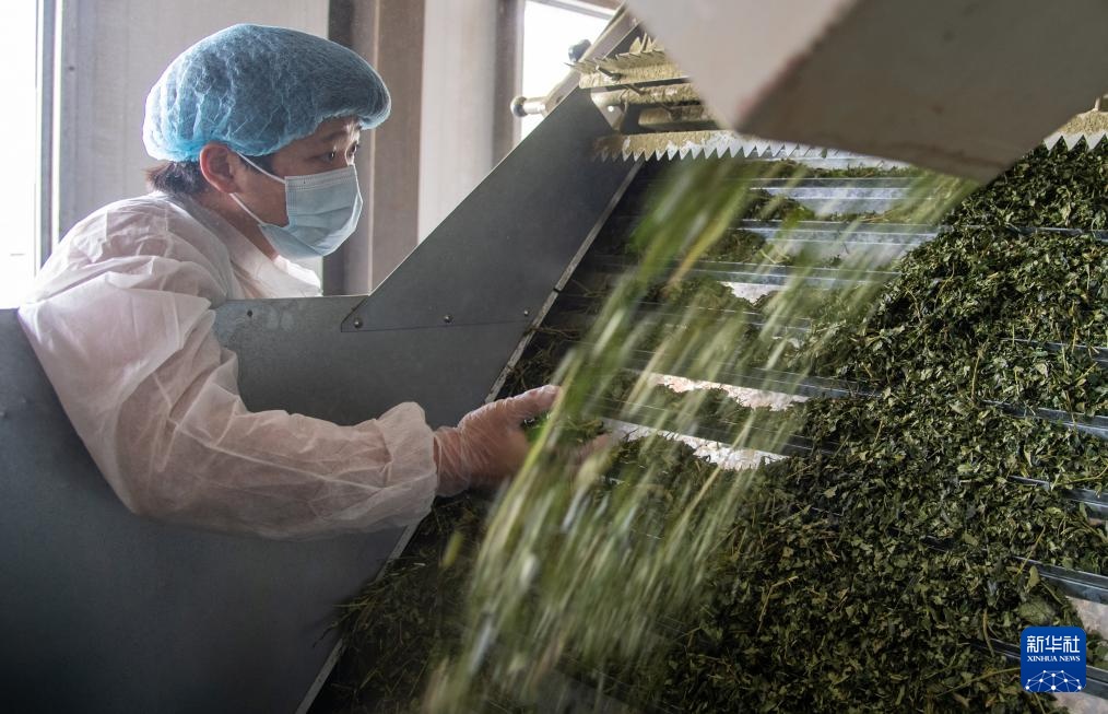 5月22日,在湖北省孝感市大悟縣金墩村湖北半兵衛(wèi)茶業(yè)有限公司生產(chǎn)車間,工作人員在檢查梗葉分離情況。