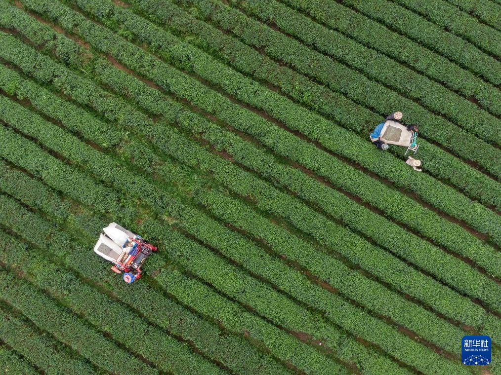 5月22日,在湖北省孝感市大悟縣金墩村湖北半兵衛(wèi)茶業(yè)有限公司茶園,村民在采茶(無人機照片)。