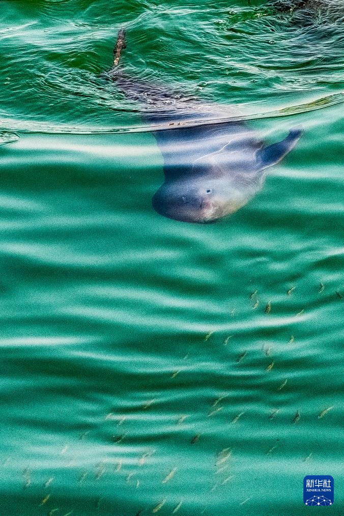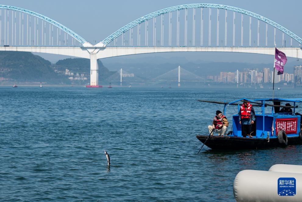 2023年2月19日,在湖北宜昌市江邊,長江江豚在水中捕食。