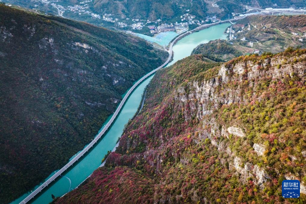 2023年12月2日,汽車行駛在湖北宜昌市興山縣水上公路上(無人機照片)。