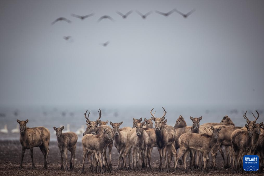 2023年12月27日,麋鹿在湖北石首麋鹿國家級自然保護區內活動。