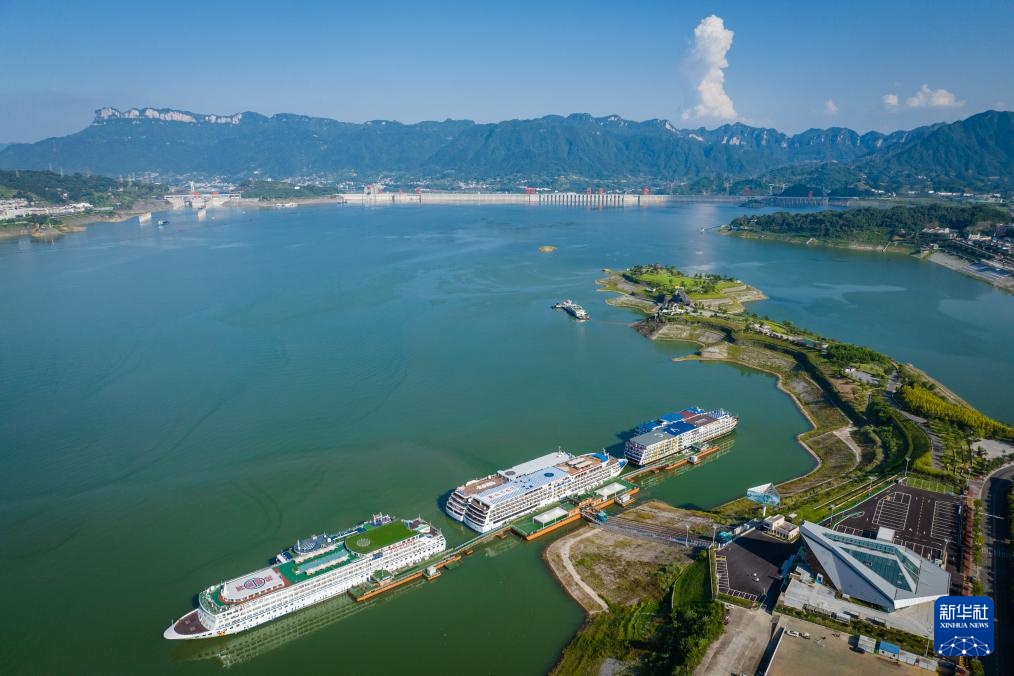 2023年8月4日,船舶停靠在秭歸港碼頭(無人機照片)。近年來,湖北宜昌市著力推進岸電建設,建成秭歸港、三峽通航綜合服務區、沙灣錨地和仙人橋靠船墩等多個岸電示范項目,率先在長江流域實現港口岸電全覆蓋,綠色岸電成為船舶待閘期間動力的主要來源。