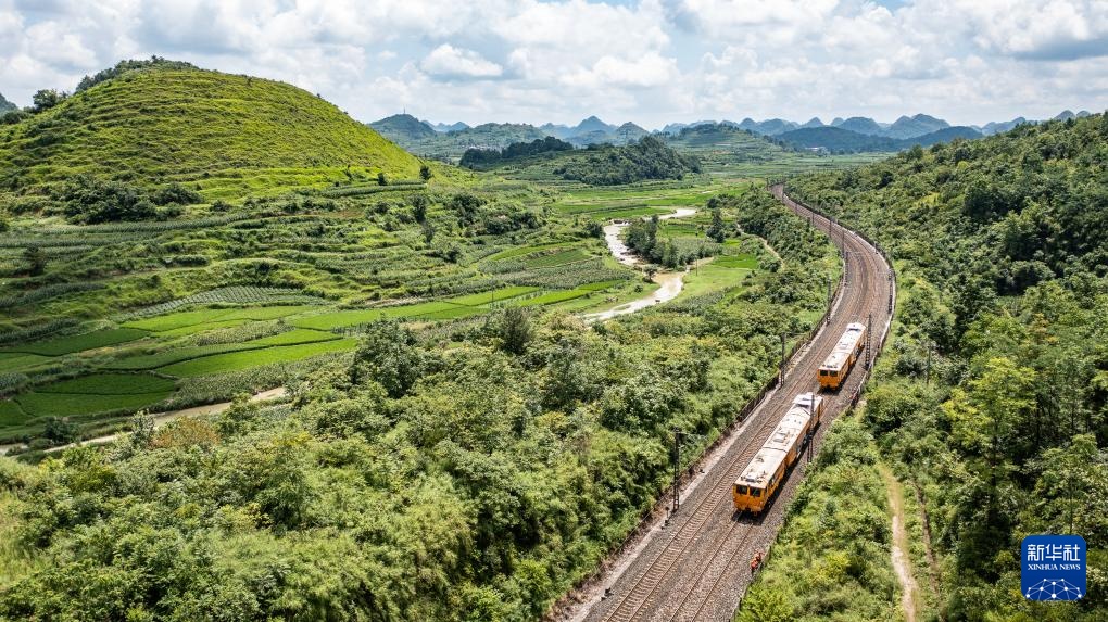 8月6日,工程車輛在滬昆鐵路貴州段進行線路大機搗固施工(無人機照片)。