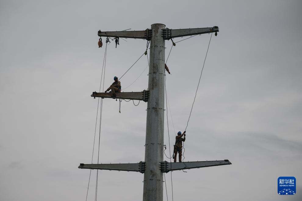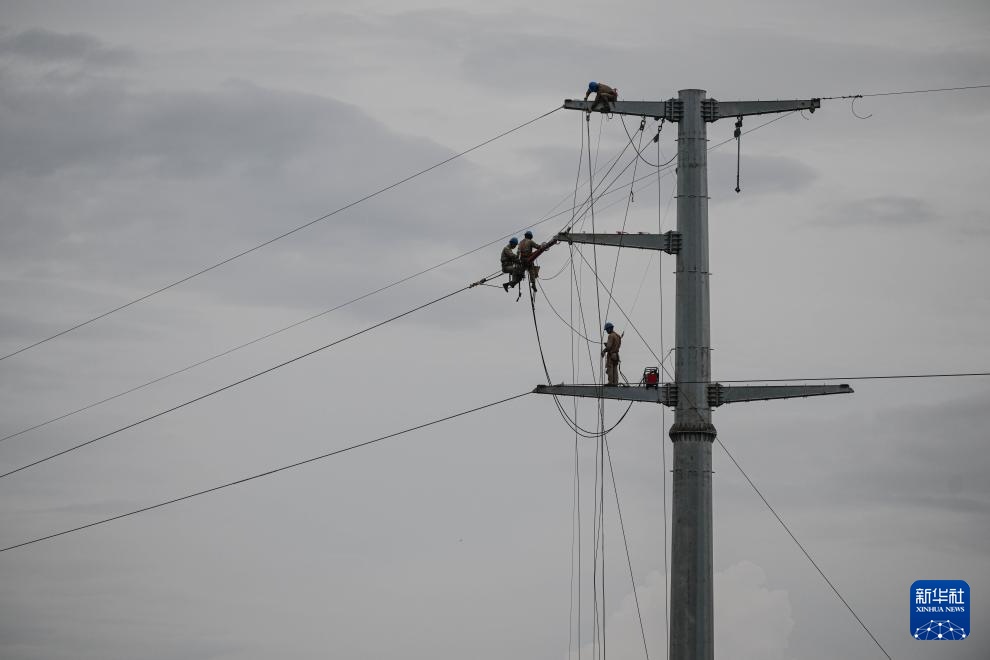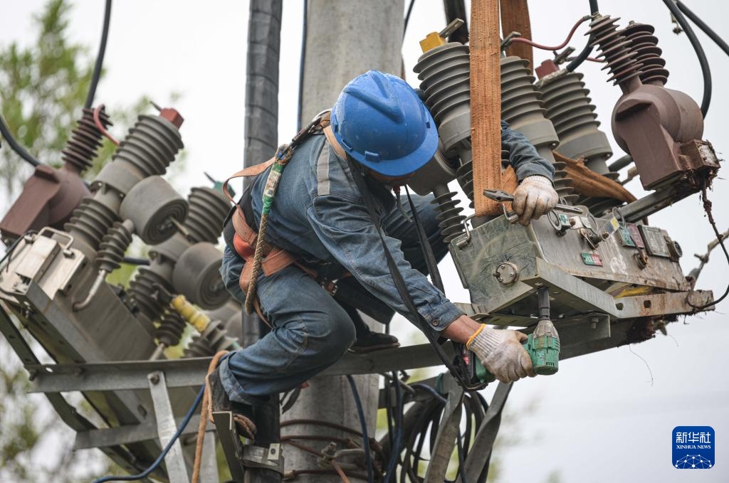 9月9日,在海南省澄邁縣,海南送變電工程有限公司的工作人員在搶修電力線路。