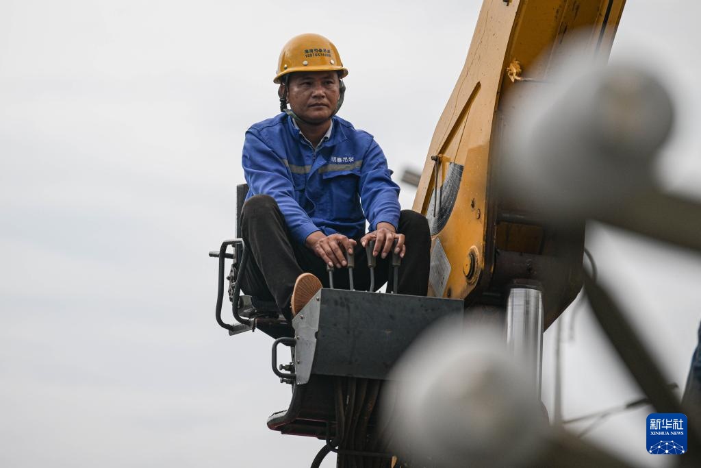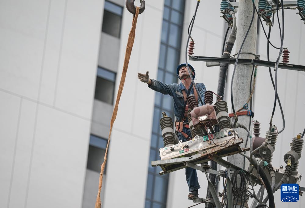 9月9日,在海南省澄邁縣一處電力線路搶修現場,工人操作機械吊運需要更換的配件。
