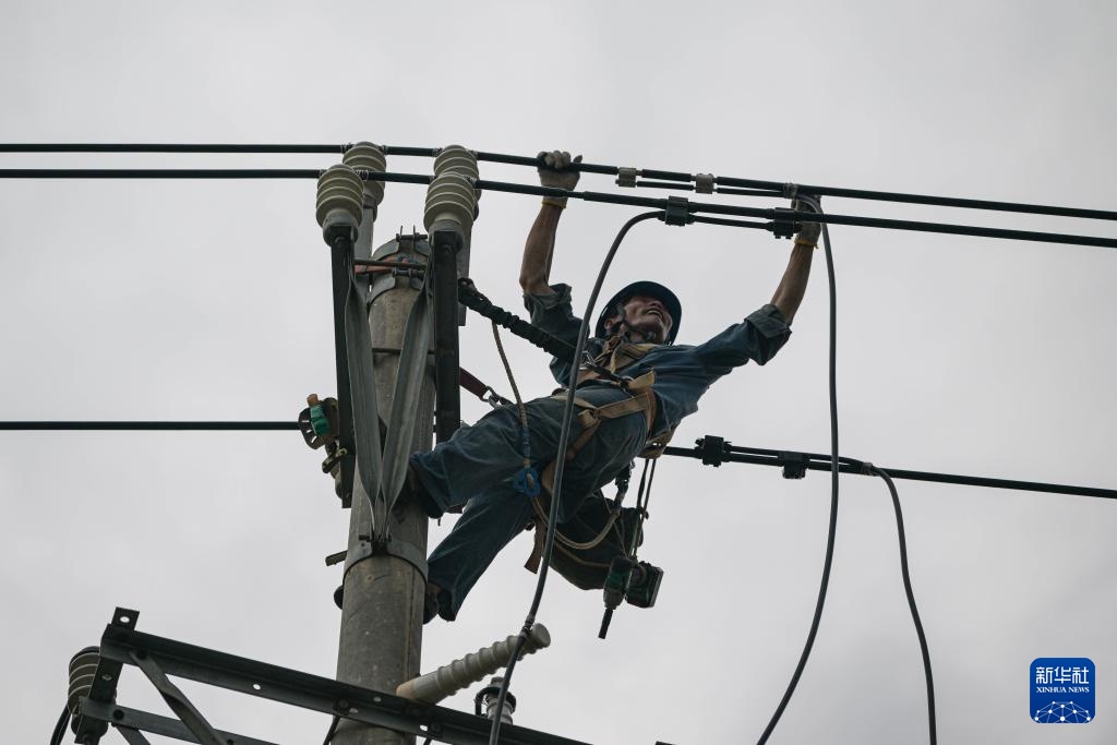 9月9日,在海南省澄邁縣,馳援海南的廣東天華電力建設有限公司工作人員在搶修電力線路。