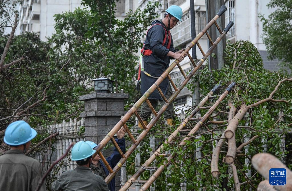 9月9日,在海南省澄邁縣,海南電網公司澄邁供電局的工作人員在搶修電力線路。